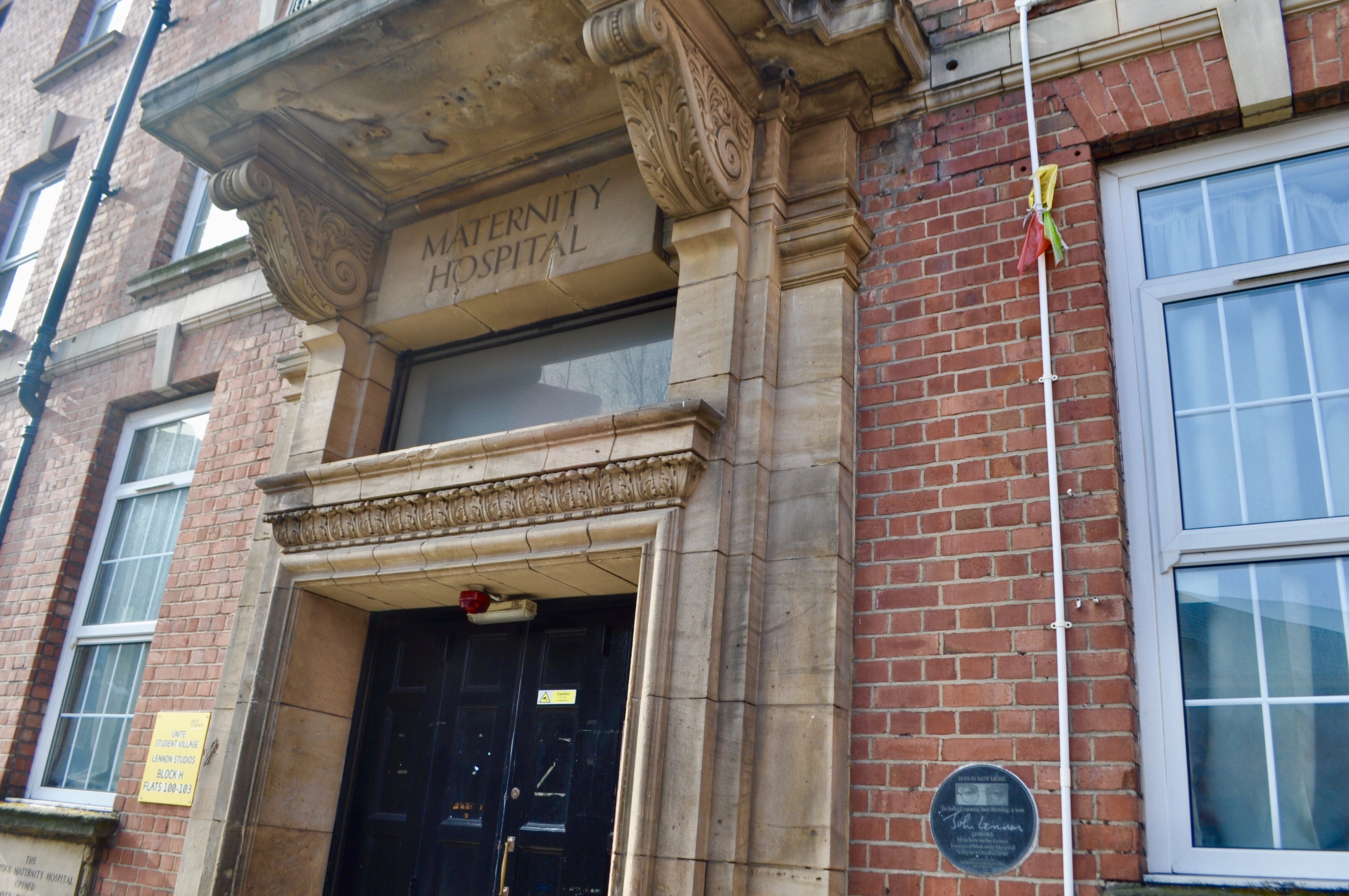 La maternidad donde nació John Lennon. Una placa lo recuerda, como casi todos los lugares emblemáticos que son reverenciados con un círculo azul que los identifica o una placa.