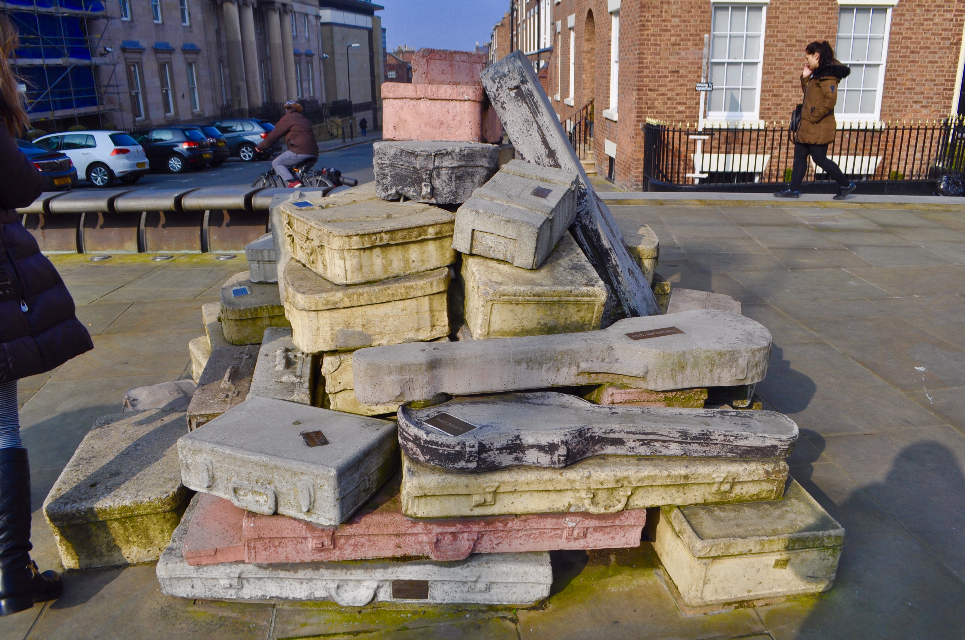 En el recorrido pasamos por «A Case History» o «Historia de una maleta». Un monumento que contiene nombres de personajes famosos que visitaron Liverpool.
